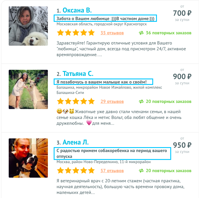 Давайте посмотрим на анкеты популярных догситтеров: в заголовках живые эмоциональные фразы, привлекающие внимание клиента.
