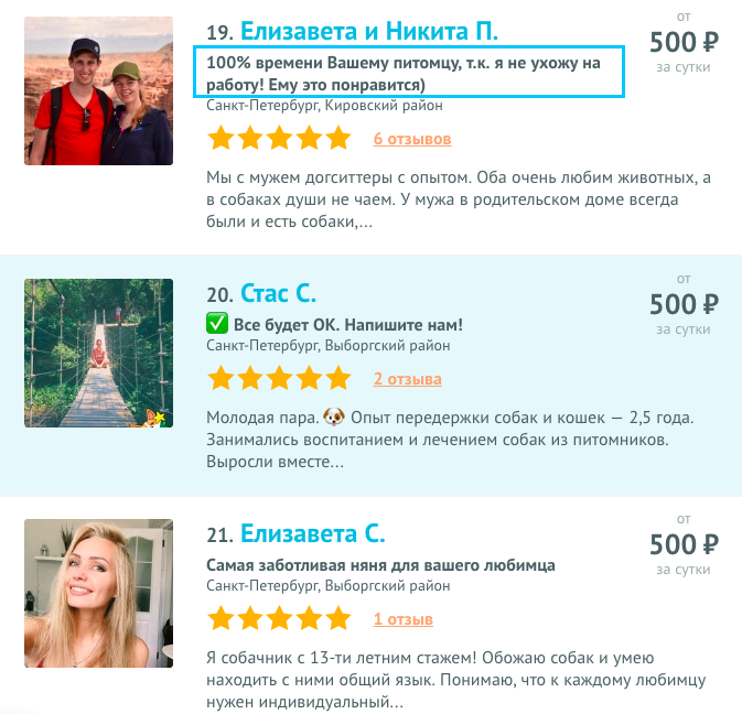 Давайте посмотрим на анкеты популярных догситтеров: в заголовках живые эмоциональные фразы, привлекающие внимание клиента.