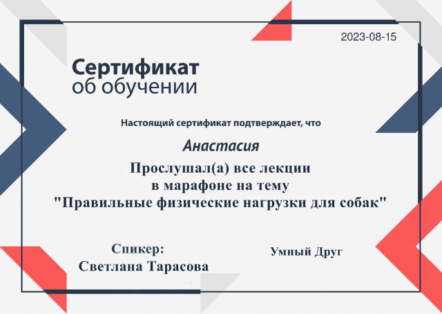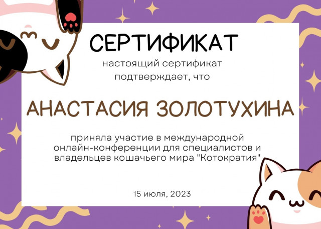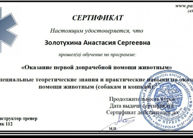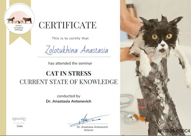 Я постоянно учусь и развиваюсь в сфере ухода за животными. Прохожу курсы, смотрю эфиры со специалистами, участвую в конференциях. В числе обучений: курсы по правильным прогулкам и играм от платформы Умный друг; марафон по физическим нагрузкам от Светланы Тарасовой; титач-курс по работе с пожилыми собаками от Юлии Розовой; цикл лекций по здоровью собак от кинологической школы “Друг”; конференция по благополучию котиков “Котократия”; лекция от Школы Этологии про стресс у кошек. Это лишь часть моего образования.