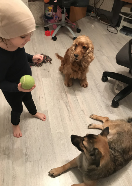 Дочь любит играть с питомцами, да и мы тоже. Но вы должны быть уверены, что собака ладит с детьми. Вообще у нас вся семья собачников, поэтому внимание от каждого члена семьи обеспечено)