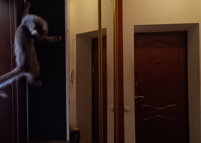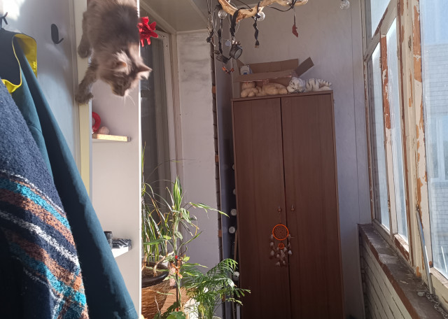 Для кошек, помимо длинного подоконника на балконе есть специальная высоко расположенная лежанка с видом на улицу и комнату одновременно и уютное место на шкафе, чтобы побыть одному. Также для кошек есть когтеточка под потолок, по которой очень классно с разбегу забираться наверх - отличный способ выпустить лишнюю энергию и тревогу от разлуки с хозяином в развеселом тыгыдыке.
