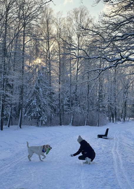 С Чарли на прогулках мы играем, занимаемся трюками, выдержкой, ситуативным тренингом вроде спокойного перехода дороги, пропуска собак и т.п.