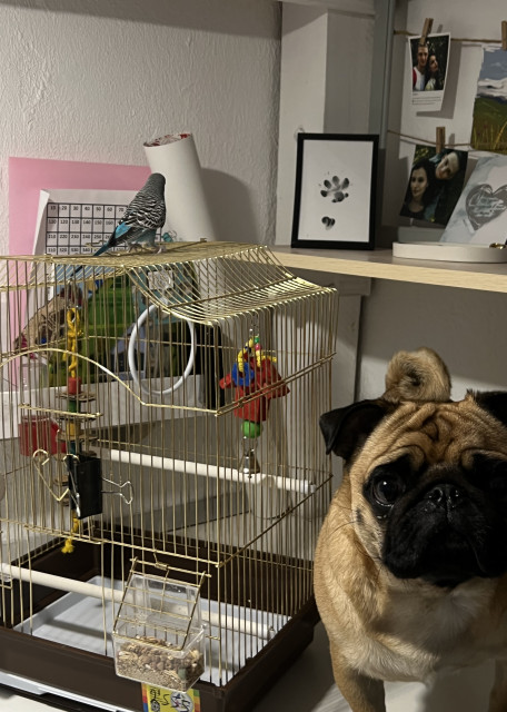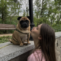 Добрый день! Я очень люблю животных, сейчас у меня есть небольшая собака- мопс Майк, ему 5 лет, максимально добрый парень, дружит даже с кошками и попугаями 😅