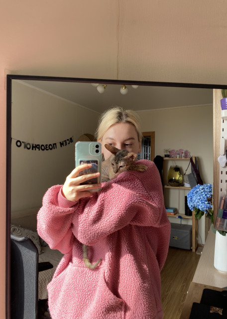 Спокойная, любит чиллить на диванчике. К собакам и котам спокойна.