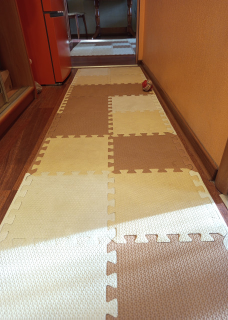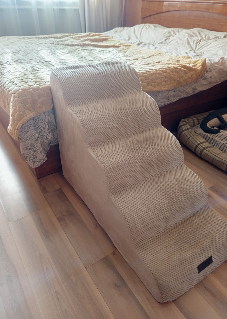 Мы используем дома мягкие полы, чтобы минимизировать нагрузку на спину и коленные суставы. Также в наличии имеются две лестницы для комфортного подъёма на диван/кровать.