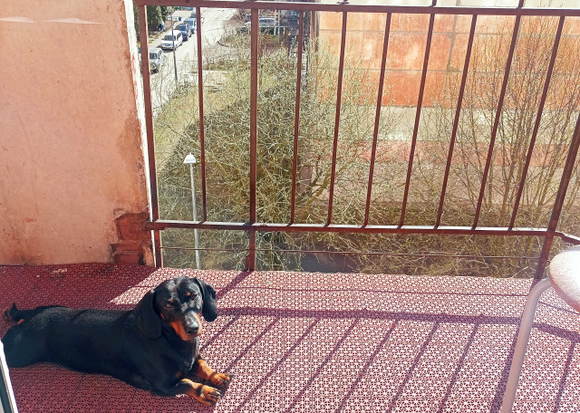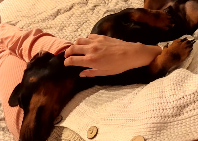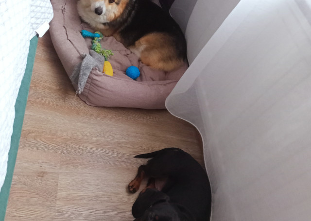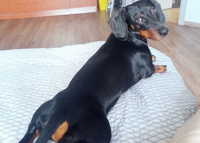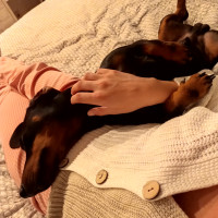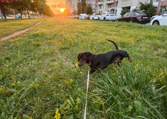Такса гладкошерстная карликовая, НО с Авито, поэтому не совсем карликовая. Что-то между стандартом и карликом. Вес 11-12 кг, и это мышцы. Считает прогулку тренировкой, поэтому выкладывается на максимум, из дома лучше выходить на коротком поводке ибо сразу берет разгон. Знает команды "ко мне", "фу", "нельзя", "ждать", "сидеть", "лежать", "лапу", "круть-верть".