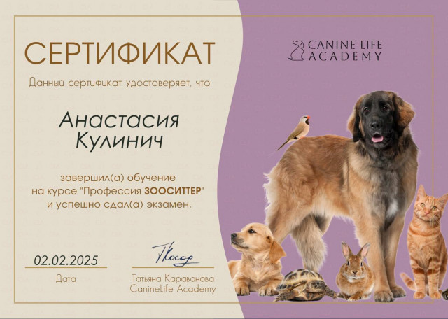 - закончила профессиональный курс в Canine Life Academy и успешно сдала экзамен;